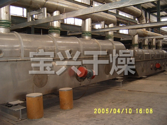 物料自进料进口进入机内,在振动力作用下,物料沿水平面流化床抛掷,向前连续运动,热风向上穿过流化床同湿物料换热后,湿空气经旋风分离器除尘后由排风1:3排出.干燥物料由排料进口排出。