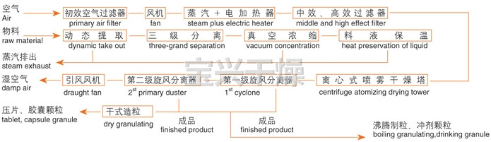 中药浸膏高速离心喷雾装置是离心式喷雾干燥技术在特定物料干燥中的应用,也是利用高速离心式雾化器使物料分散成雾状,与热空气充分接触,完成瞬间干燥,形成粉状成品的干燥装置。