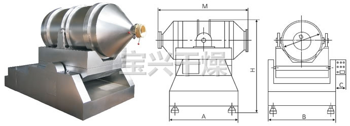 EYH二维混料机的转筒可同时进行二个运动,一个为转筒的转动,另一个为转筒随摆动架的摆动。被混合物料在转筒内随转筒转动、翻转、混合的同时,又随转筒的摆动而发生左右来回的掺混运动,在这两个运动的共同作用下,物料在短时间内得到充分的混合。EYH二维混料机适合所有粉、粒状物料的混合。