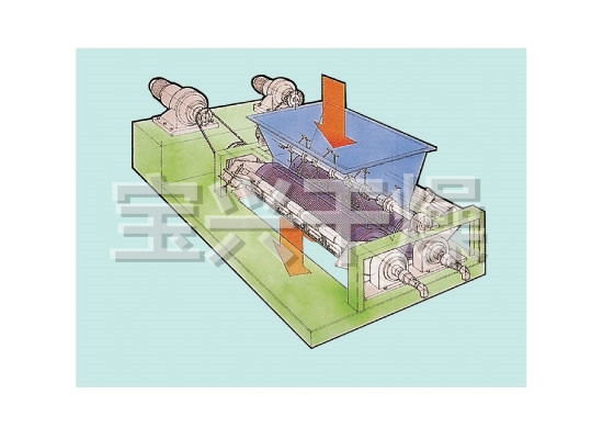 ◎槽形成型机: 由加料斗和刻有槽的二根辊子构成。以增大物料表面积的造粒为目的。物料被内侧运转的辊子吸入,被反转的外侧刮刀切成粒状。