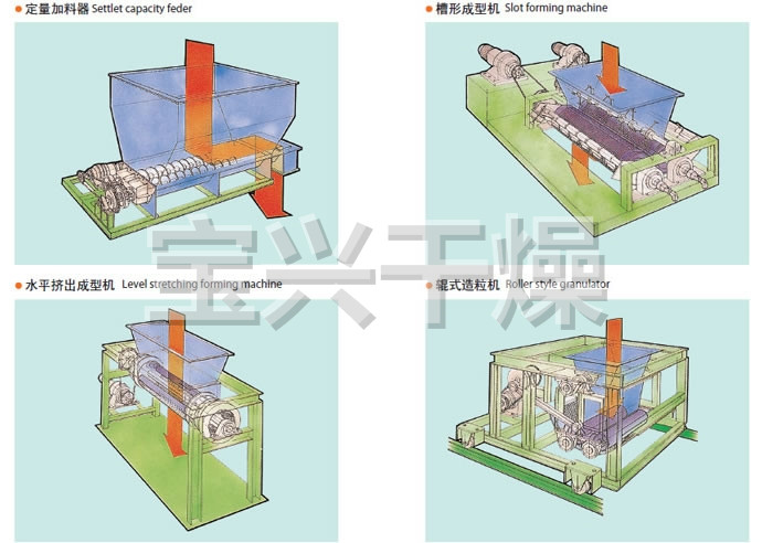 ◎水平挤出成型机: 由加料斗、二根辊子和U形振动网构成。以增大物料的表面积为目的,造粒物料与振动网接触,由旋转辊子的强制压力挤出网外,形成圆柱形的颗粒。
