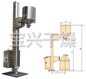 TJG 系列固定提升加料机由两部分组成,即提升机及底座。提升机由机架、液压提升系统及料门翻转机构组成。工作时,先将提升机的料门与料桶扣合,启动提升操作杆,料门与料桶一起上升,启动翻转操作杆,料桶即可番转180度,呈底桶向上姿态并移动到所需位置,利用料门上出料蝶阀,可很容易将物料加入所需的工艺设备中。